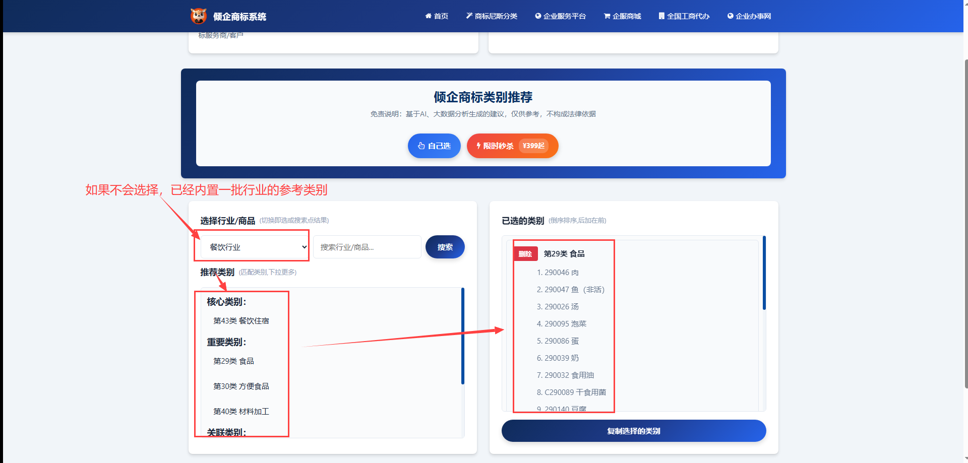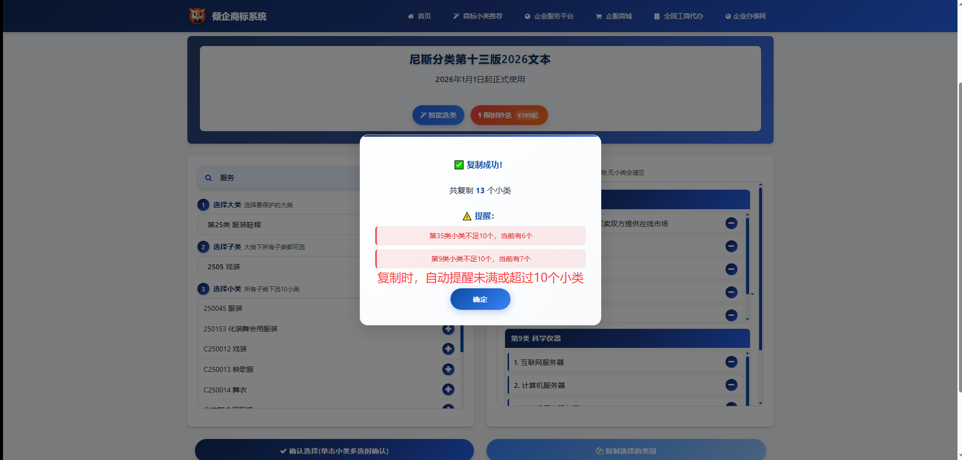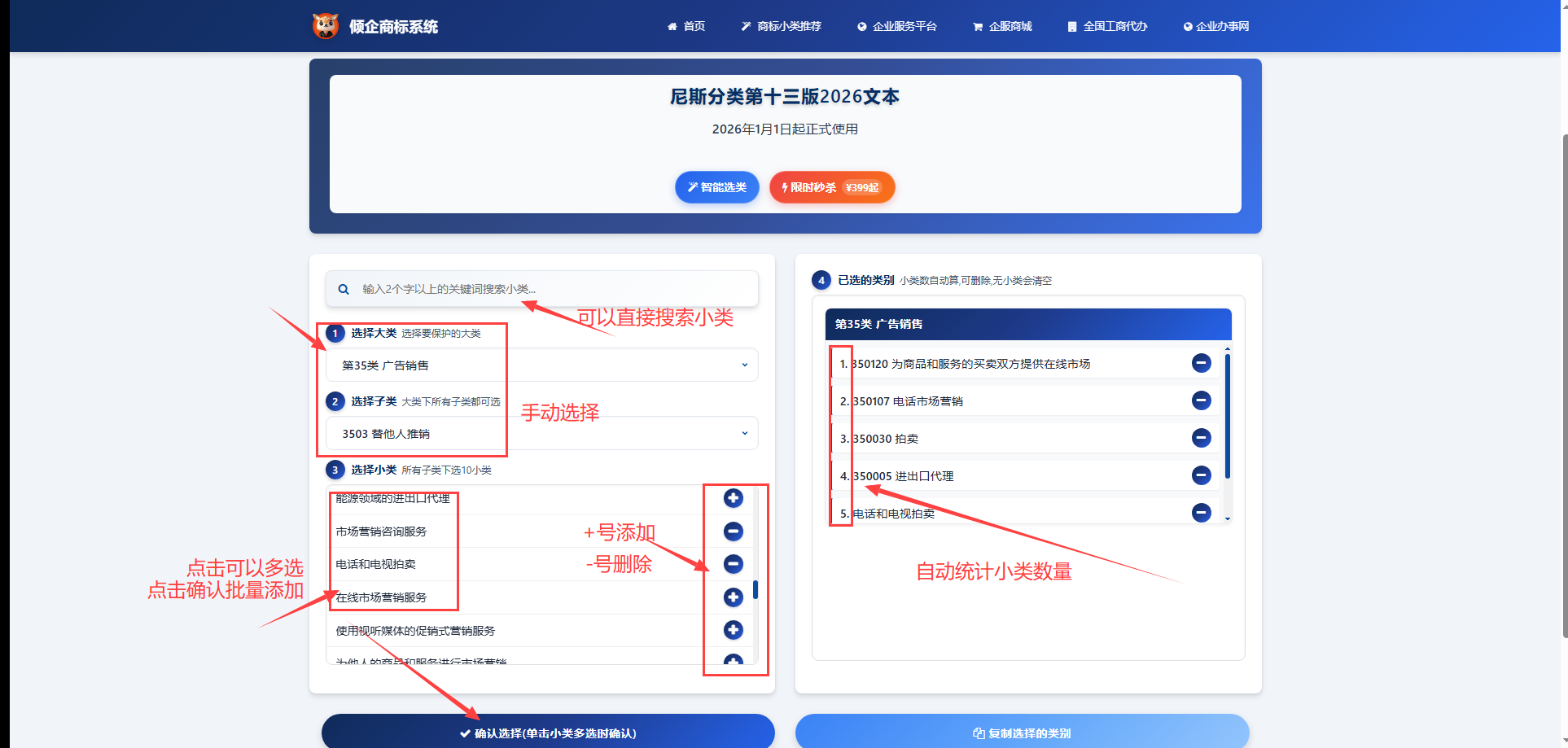 倾企企服商标选类工具2.0为适配2026版尼斯分类(第十三版)升级,聚焦商标选类的精准性与效率,核心功能如下: