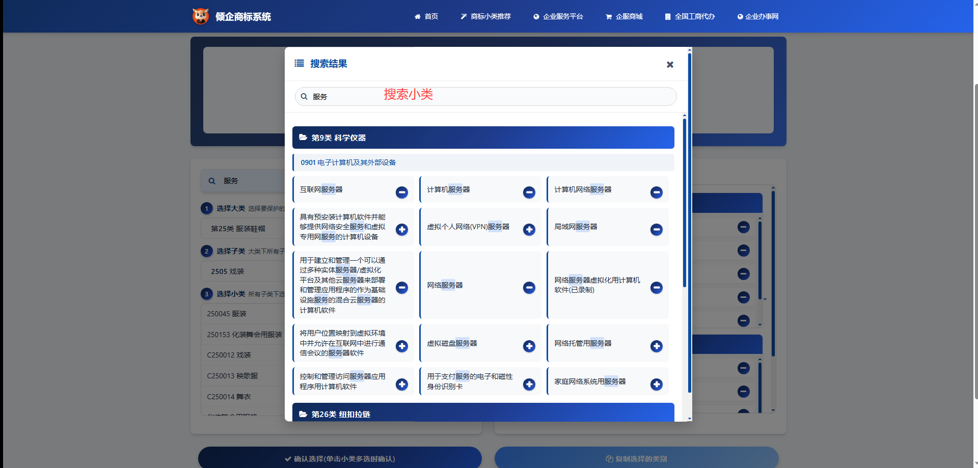 1. 双模式智能检索,兼顾“快速定位”与“系统浏览”支持关键词精准搜索:输入商品/服务关键词(如“室内设计”“电热服装”),可直接定位对应类别及小类,避免人工翻找的繁琐;支持逐级步进选择:按“选择大类→选择子类→选择小类”的层级流程操作,可系统化浏览全部分类结构,适合需全面梳理类别的场景,同时防止跨大类错误选择。